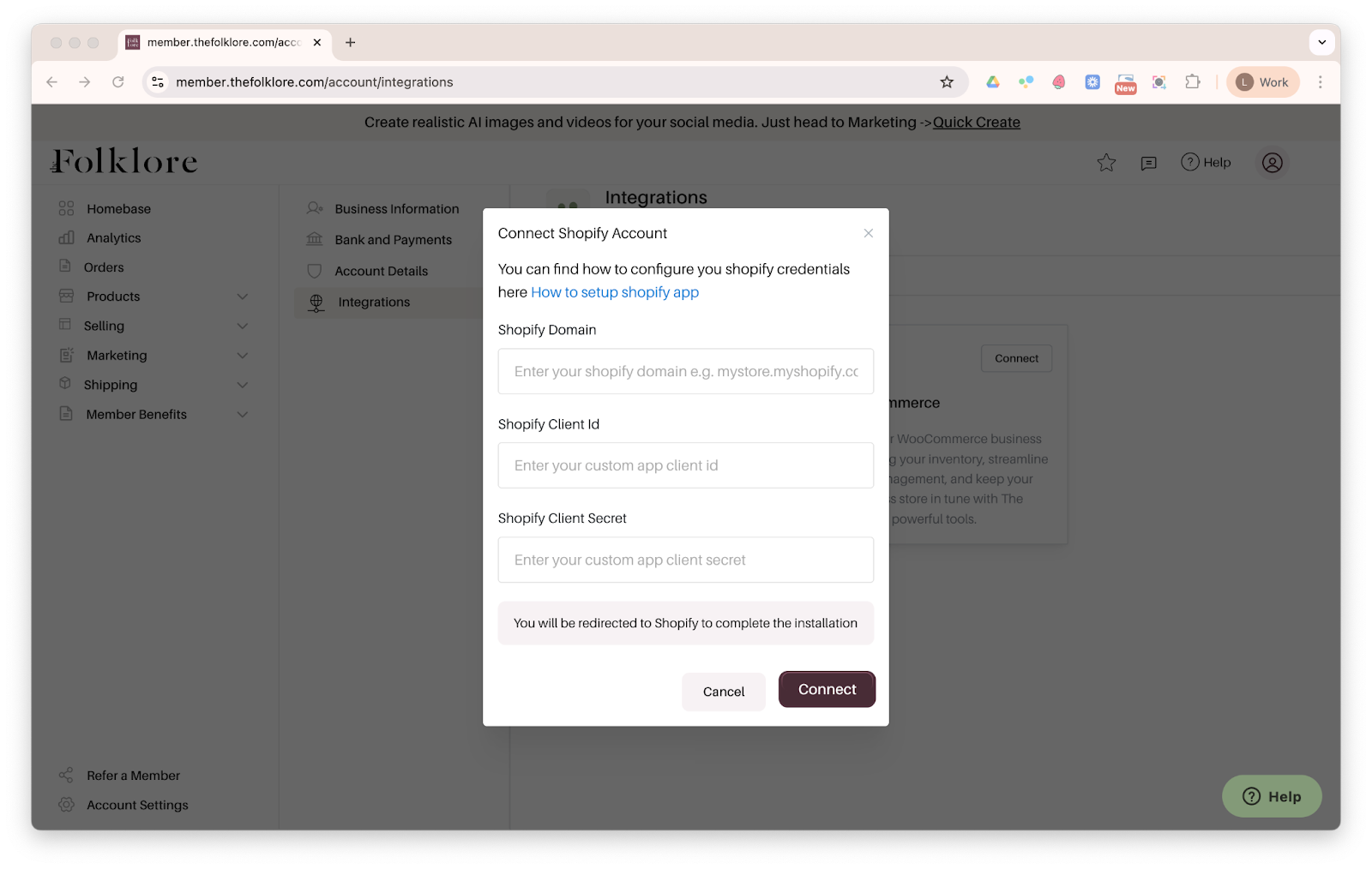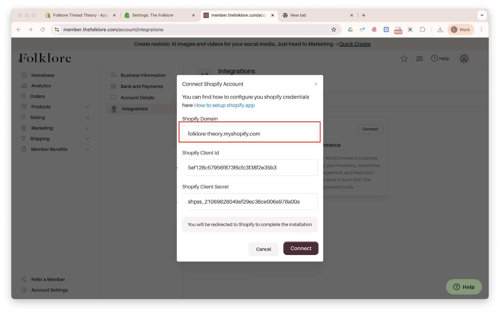 Step 3: Copy your credentials from Shopify to The Folklore