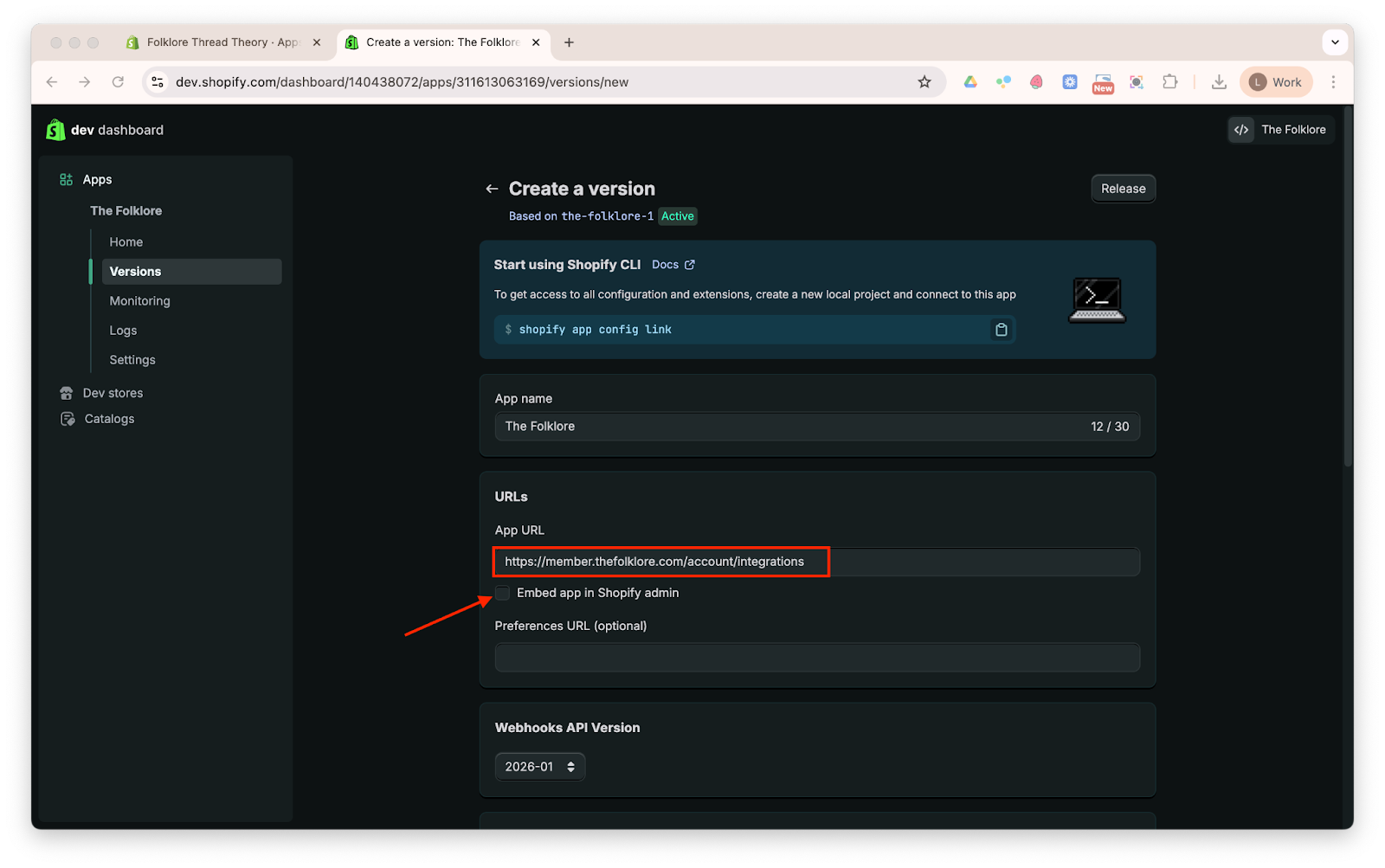 a. Under App URL enter “https://member.thefolklore.com/account/integrations”.