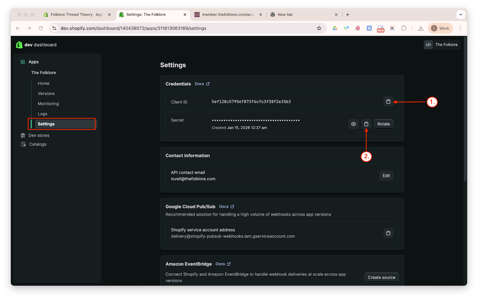 - Repeat the same step for the Secret. Click the clipboard icon next to the Secret (labeled 2 in the first image) to copy it. Then return to the open The Folklore integration tab and paste the copied value into the Shopify Client Secret field (labeled 2 in the second image).