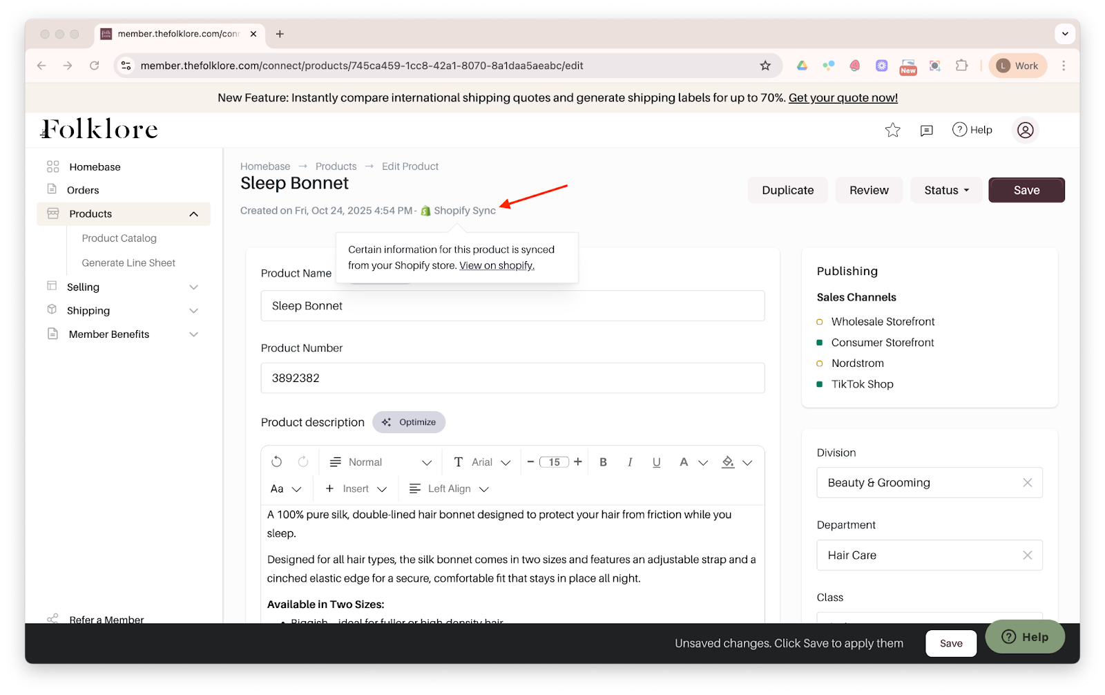 You can control how your product information syncs between your Shopify or WooCommerce store and The Folklore.