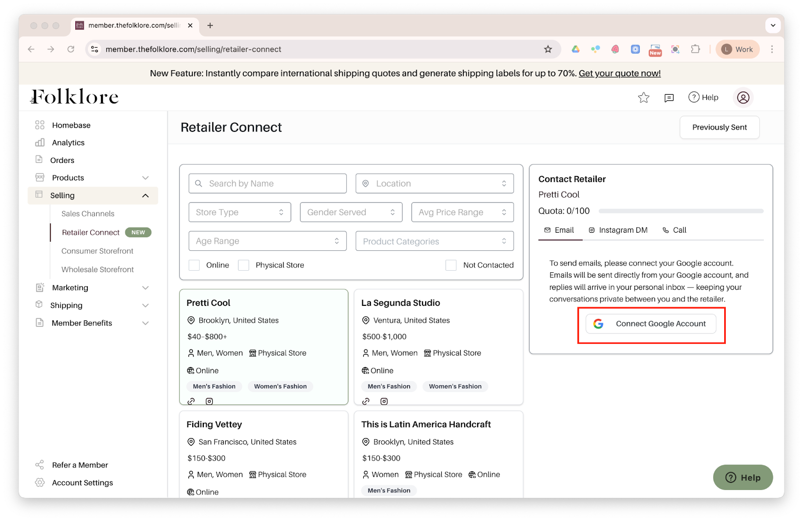 To contact retailers, you must first connect your Gmail account. This allows you to send emails directly from the platform, and replies will go straight to your personal inbox.