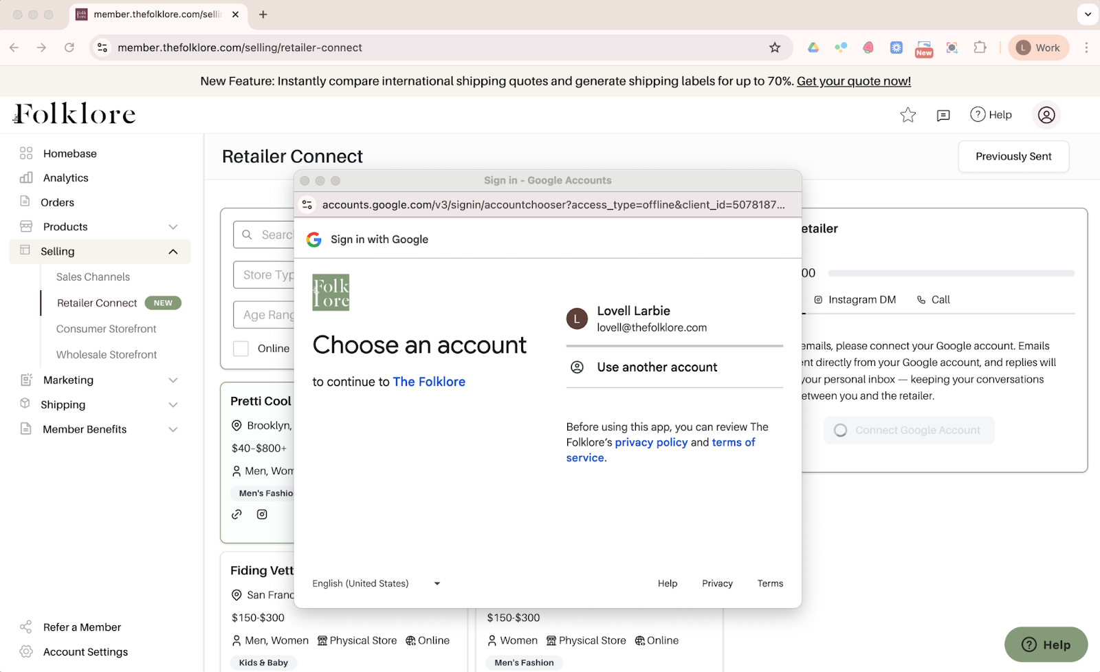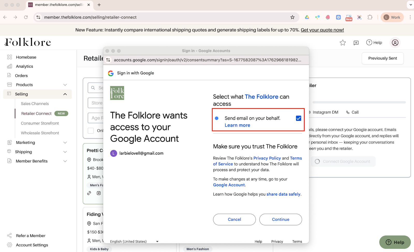 Once you click "Continue," the pop-up window will close, and you will be returned to the Retailer Connect page. You will see a confirmation notification for a successful connection, and the "Connect Google Account" button will be replaced with a text box for you to compose your email.